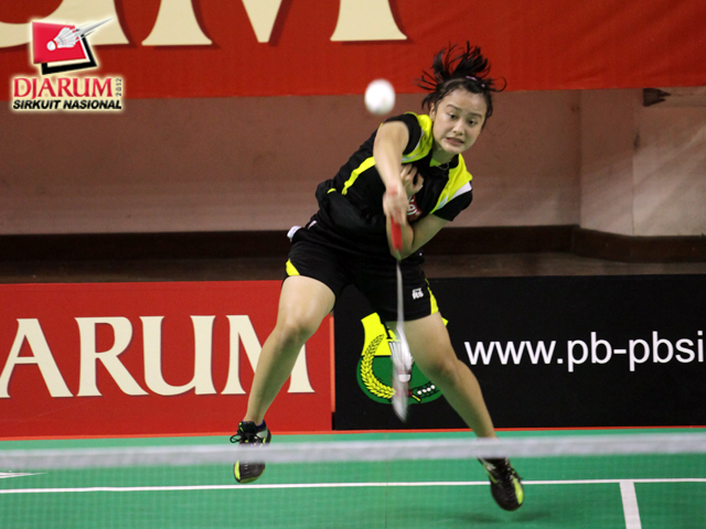 Intan Dwi Jayanti (PB Djarum Kudus) melepaskan smash keras ke arah Sheren Regina (Pelatprov PBSI DKI Jakarta).