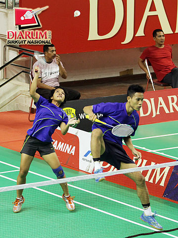 Pasangan Rendra Wijaya/Tika Permatasari (PB Djarum Kudus/SGS PLN) bersiap menyambar bola tanggung yang dilepaskan pasangan Trikus Harjanto/Vita Marissa (Pertamina Indonesia/Tangkas Specs).