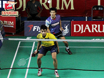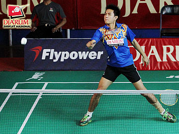 Selvanus Geh yang berpasangan dengan Ronald Alexander (Pelatnas) sedang memukul kok untuk dikembalikan kepada pasangan Darmiko (Djarum Kudus) / Samuel Paulus (Tangkas Specs).
