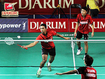 Yonathan Suryatama Dasuki yang berpasangan dengan Fernando Kurniawan (Djarum Kudus) sedang mengembalikan kok kepada pasangan Julius Rama/ Muammar Basri (Hi WUa Wima).