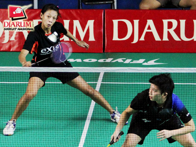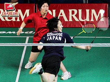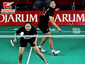 Rintan A yang berpasangan dengan Natalia Poluakan dari klub Tangkas Specs sedang memukul kok untuk dikembalikan kepada lawannya yang berasal dari Jepang, Miyoshe Nao / Moue Emi (Hokuto Bank Japan).