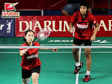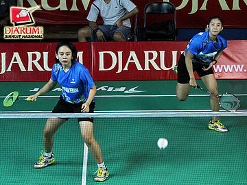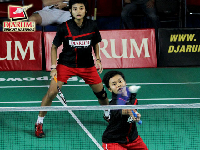 Tresna Novelia Citra Resmi yang berpasangan dengan Dara Ayu Setiawan (Djarum Kudus) sedang memukul kok untuk dikembalikan kepada pasangan Dina KhoirunniSa yang berpasangan dengan Sheren Regina Natsir (Pelatprov PBSI DKI Jakarta).