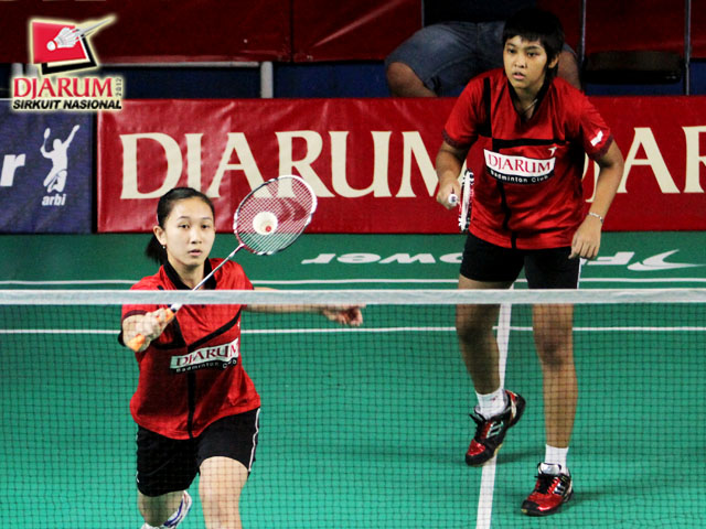 Dina KhoirunniSa yang berpasangan dengan Sheren Regina Natsir (Pelatprov PBSI DKI Jakarta) sedang memukul kok untuk dikembalikan kepada pasangan Dara Ayu Setiawan/ Tresna Novelia Citra Resmi (Djarum Kudus).
