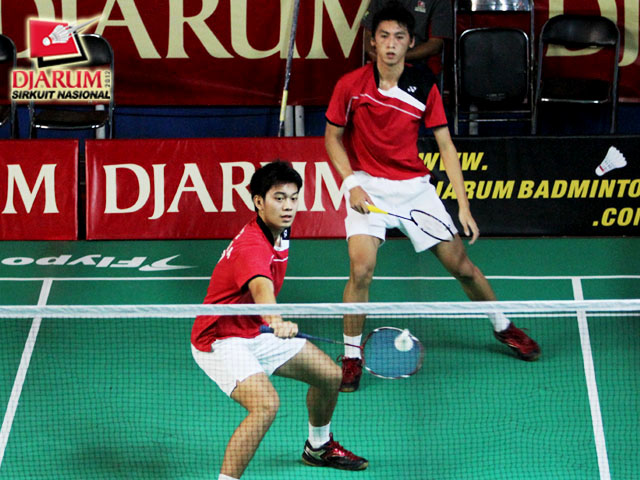 Pasangan ganda dewasa putra Darmiko (Djarum Kudus) / Samuel Paulus (Tangkas Specs) yang sedang bertanding melawan Ronald Alexander / Selvanus Geh (Pelatnas).