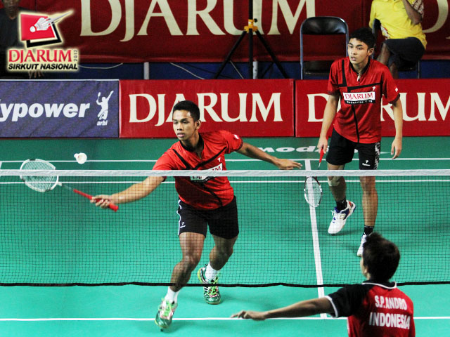 Edi Subaktiar yang berpasangan dengan Arya Maulana Aldiartama (Djarum Kudus) sedang mengembalikan kok kepada pasangan Andro Septian / Reza Aditya (Pikiran Rakyat Tasikmalaya).