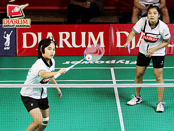 Febriani Endar Kusumawati yang berpasangan dengan Ristya Ayu Nugraheny dari Djarum Kudus sedang memukul kok untuk dikembalikan kepada pasangan Imma Muthiah Khairunisa/ Mareta Dea Giovani (Mutiara).