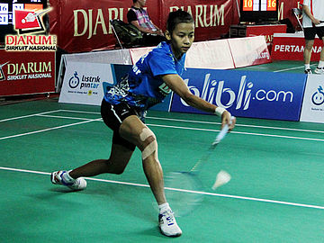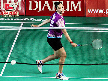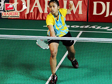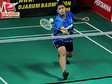 Dinar Dyah Ayustine (Djarum Kudus) sedang memukul kok untuk dikembalikan kepada lawannya, Pia Zebadiah (Pusdiklat Jaya Raya).