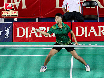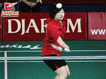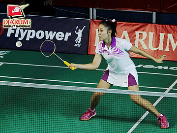 Murayama Yumi (Hokuto Bank Japan) sedang mengembalikan kok kepada lawannya, Natalia Deiske (Tangkas Specs).