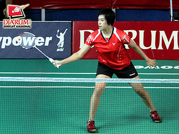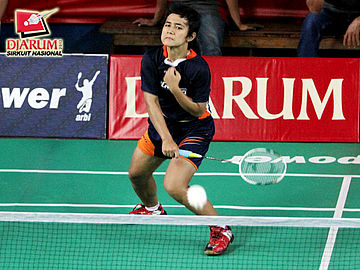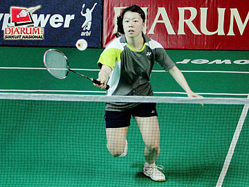 Anai Yuko (Hukoto Bank Japan) sedang berusaha mengejar kok untuk dikembalikan kepada lawannya, Millicent Wiranto (Pelatnas).