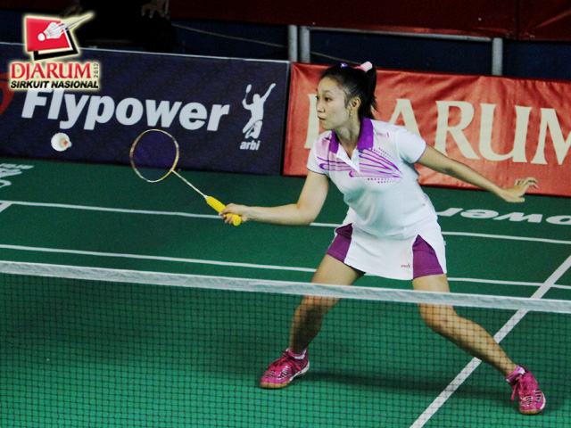 Dian Fitriani (Pusdiklat Jaya Raya) sedang mengembalikan kok kepada lawannya, Yeni Asmarani (Pelatnas).