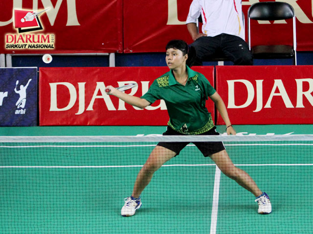 Putri Sekartaji Pungkasari (SMP/ SMA Ragunan) sedang mengembalikan kok kepada lawannya, Gladys Virginia Sumito (Taurus).