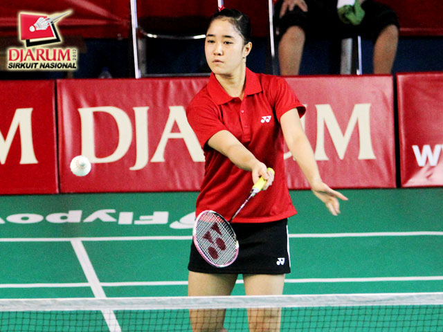 Pia Zebadiah sedang mengembalikan kok untuk dikembalikan kepada lawannya, Dinar Dyah Ayustine (Djarum Kudus).