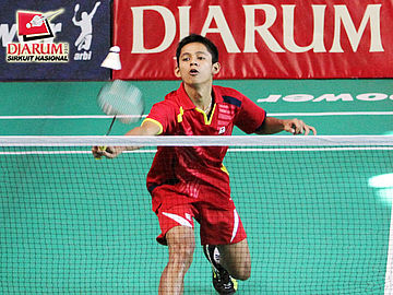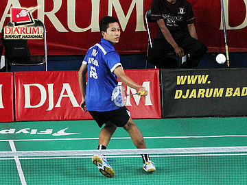 Fauzi Adnan (Jaya Raya Suryanaga) sedang mengembalikan kok kepada lawannya Indra Setiawan (Pertamina Indonesia).