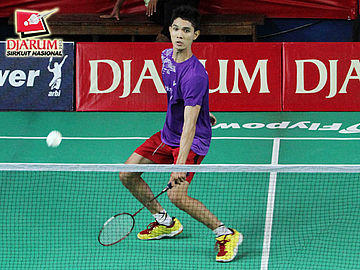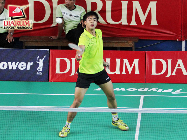 M. Bayu Pangisthu (Djarum Kudus) sedang mengembalikan kok kepada lawannya, Feby Ardiansyah Ramadhan (Mutiara Bandung).