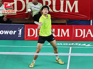 Reksy Aureza Megananda (Djarum Kudus) sedang mengembalikan kok pada saat berlaga melawan Elham Saptono Mulyo (Mutiara Bandung).