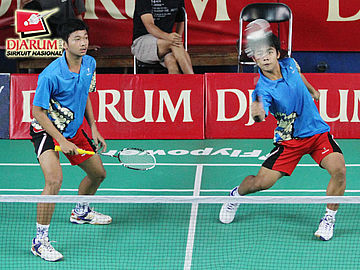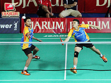 Kevin Sanjaya Sukamuljo yang berpasangan dengan Rafiddias Akhdan Nugroho dari Djarum Kudus sedang memukul kok untuk dikembalikan kepada pasangan Anindyo Pradana / Steven Gozali (Pusdiklat Jaya Raya).