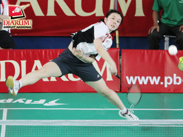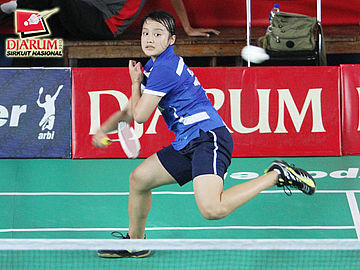 Moue Emi (Hokuto Bank Japan) sedang memukul kok untuk dikembalikan kepada Novalia Agustiani (Tangkas Specs).