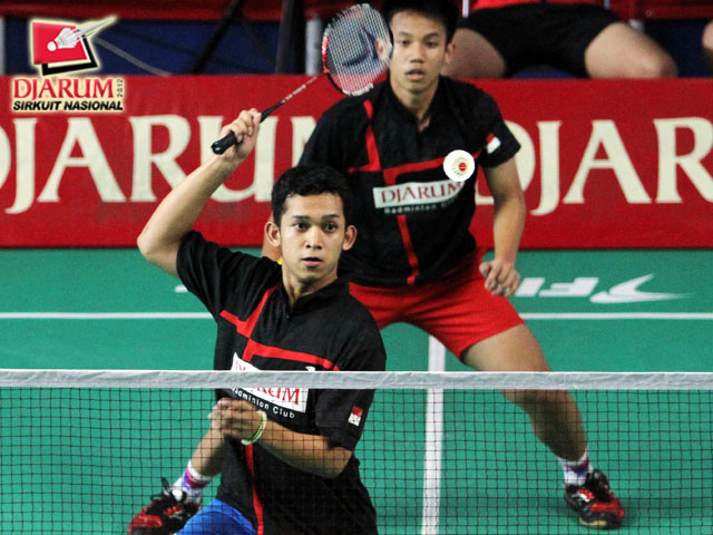 Pasangan R. Eka Fajar K / Rian Swastedian dari Pusdiklat Jaya Raya yang sedang bertanding melawan pasangan Kevin Esra/ Ricky Alverino Sidharta dari Djarum Kudus.