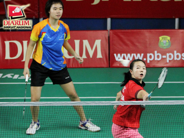 Della Augustia Surya (Djarum Kudus) yang berpasangan dengan Tri Ria Maya (Pusdiklat Jaya Raya) sedang mengembalikan kok kepada pasangan Afni Fadilah / Putri Sekartaji Pungkasari (SMP/ SMA Ragunan).