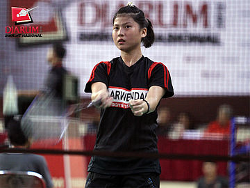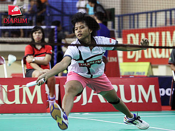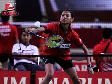 Pemain PB Djarum, Anes Penty Naris berusaha mengembalikan kok ke arah pemain Fisita.