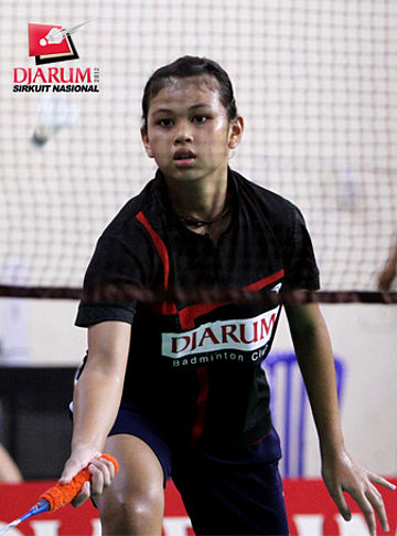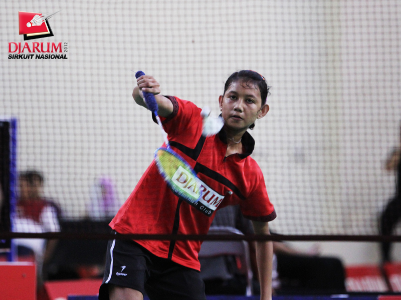 Pemain PB Djarum, Rifa Putri Aida, berusaha mengembalikan kok ke arah pemain Pusdiklat T, Nur Ayu.
