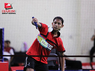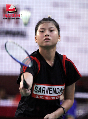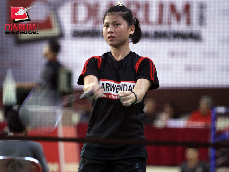 Pemain Jaya Raya Suryanaga, Meirisa berusaha mengambalikan kok ke arah pemain PB Exist, Priskila S.