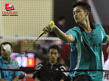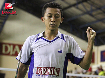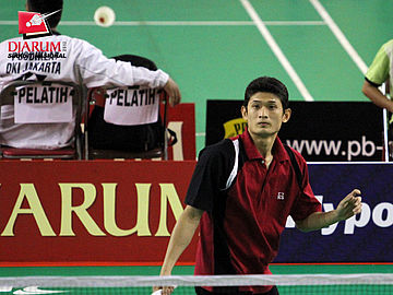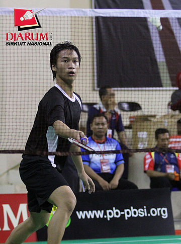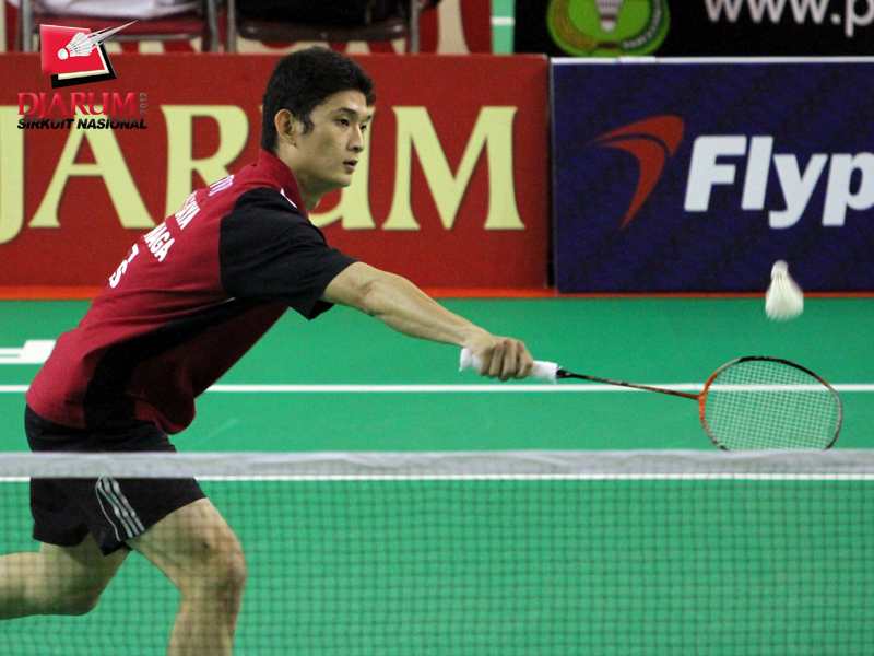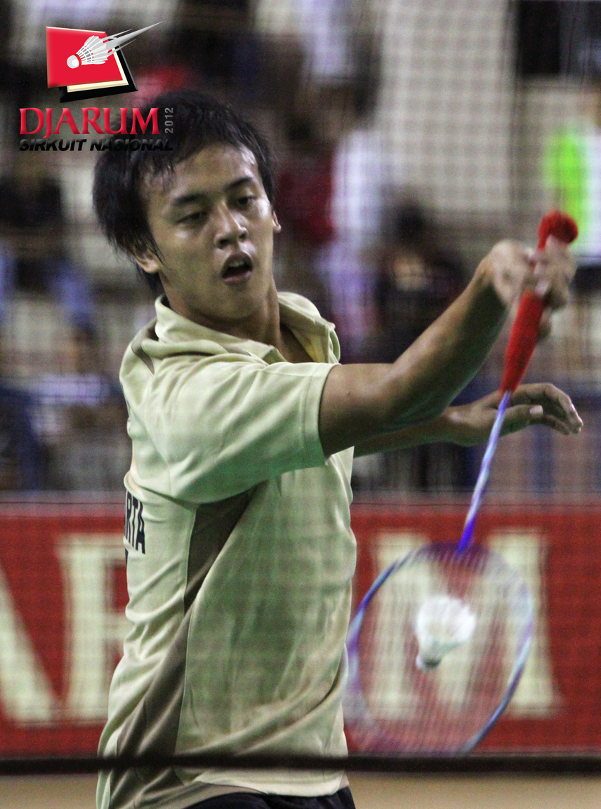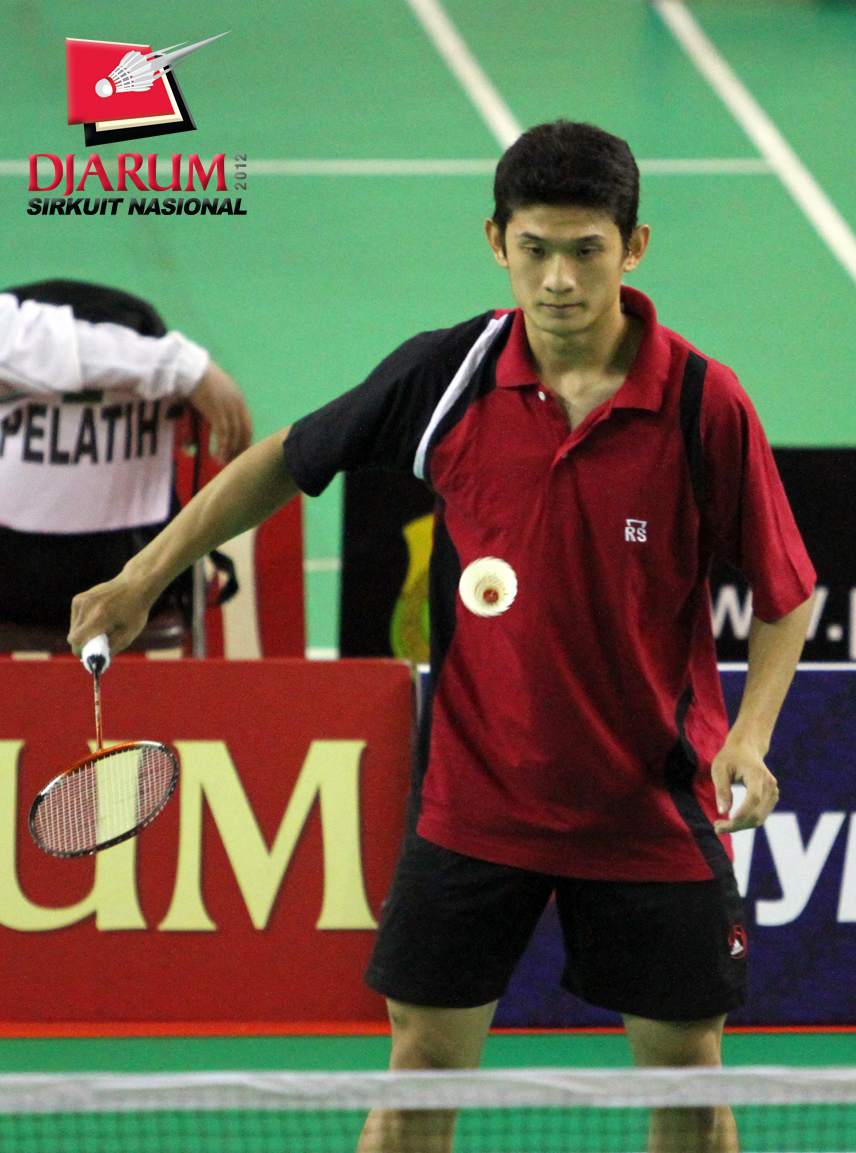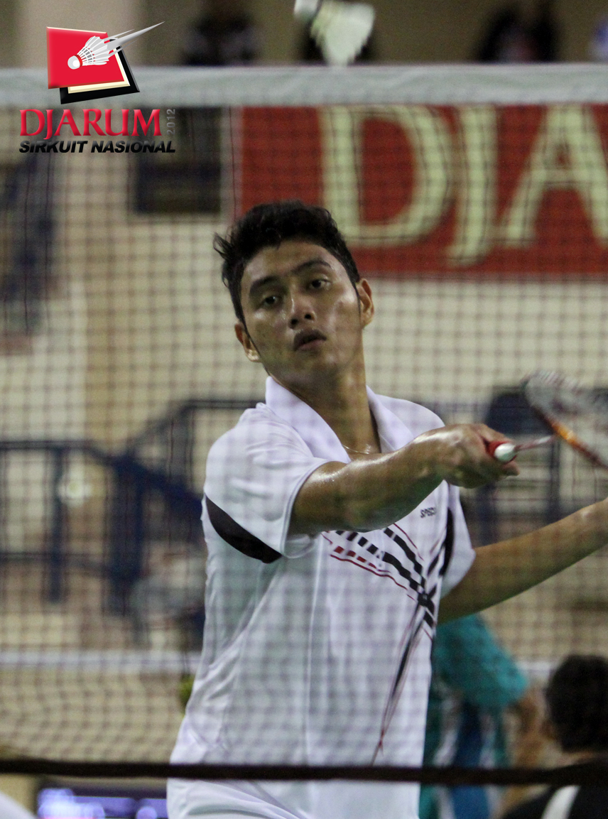 Pemain Pelatprov DKI Jakarta, M Luthfi S, berusaha mengembalikan kok ke arah pemain Tangkas Alfamart, Rico H.