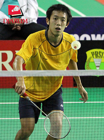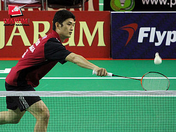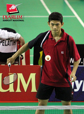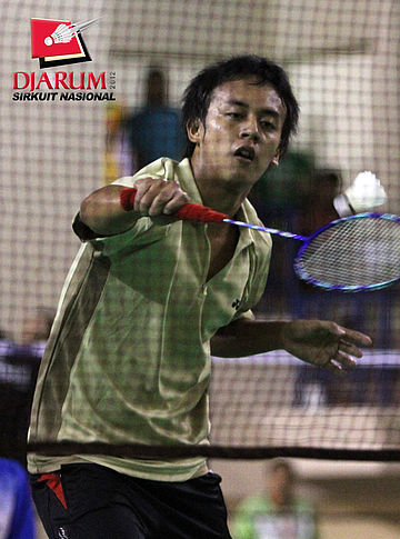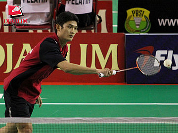 Pemain Jayaraya Suryanaga, Tan Tony, berusaha mengembalikan kok ke arah pemain Mustika, Zainor.