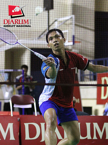 Pemain Tangkas Alfamart, Hamdani, berusaha mengembalikan kok ke arah pemain lawan.
