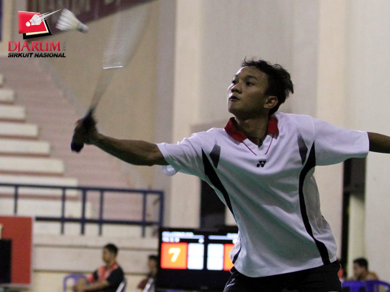 Pemain Pelatprov DKI Jakarta, Aris Munandar berusaha mengembalikan kok ke arah pemain Tangkas Alfamart, Nathaniel ES.