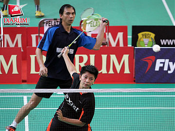 Pemain tunggal dewasa putra asal Jaya Raya Suryanaga, Fauzi Adnan berusaha mengembalikan kok ke arah pemain Bank Kaltim, Edy S.