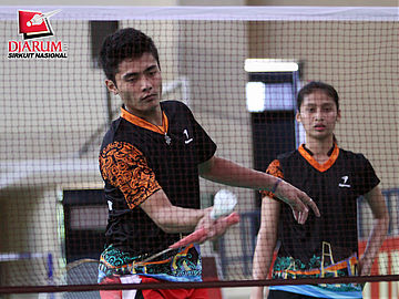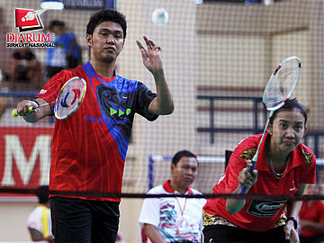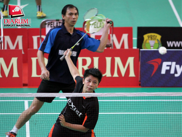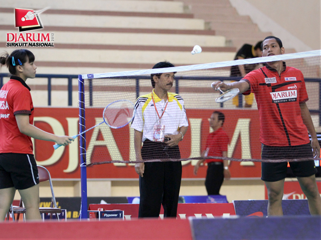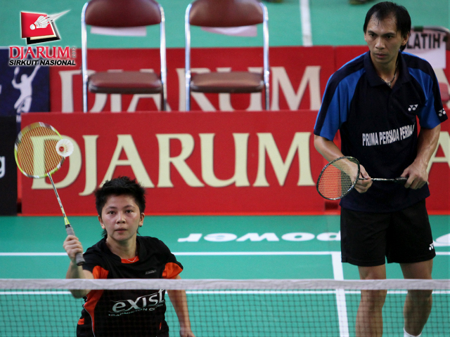 Natalia Poluakan dan pasangannya asal SGS PLN Bandung, Flandy Limpele berusaha mengembalikan kok ke arah pasangan asal Nurmansyah/Siti dari PB Pelabuhan.