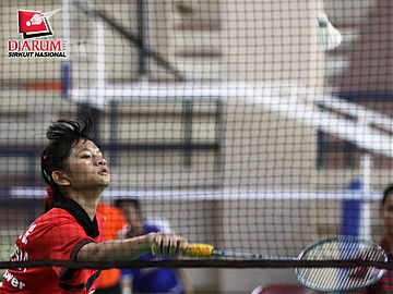 Pemain tunggal pemula putri asal PB Djarum, Serena Kani berusaha mengembalikan kok ke arah pemain PB Exist, Annisa.