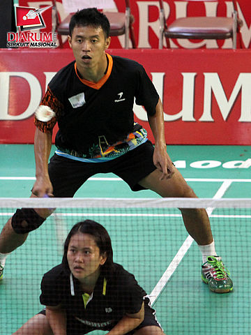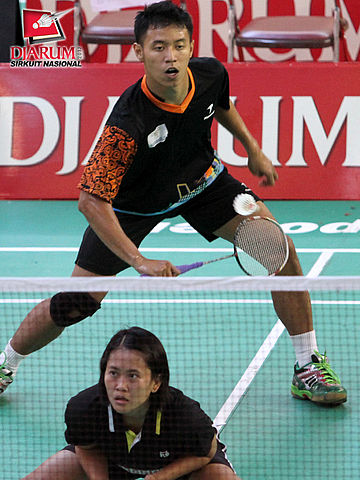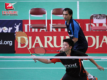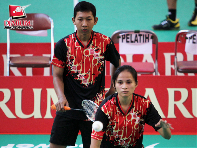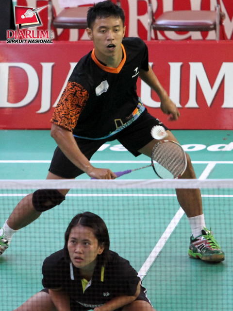Flandy Limpele dan pasangannya asal SGS PLN Bandung, Natalia Poluakan berusaha mengembalikan kok ke arah pasangan asal Nurmansyah/Siti dari PB Pelabuhan.