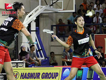 Pasangan asal SGS PLN Bandung, Devi Tika Permatasari/Keshya Nurvita berusaha mengembalikan kok ke arah pasangan Pusdiklat Jaya Raya, Aris Budiharti/Dian Fitriani
