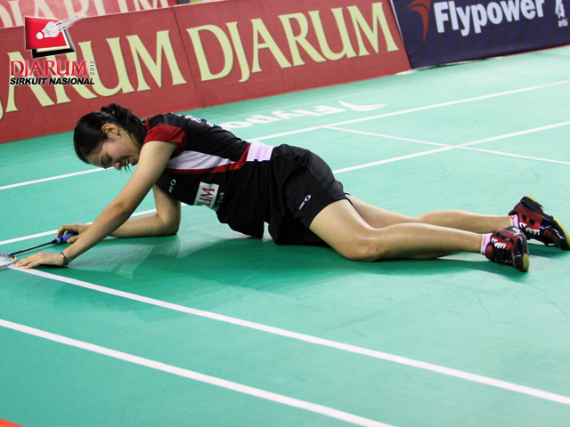 Febby Angguni (PB Djarum) terjatuh ketika berusaha mengembalikan kok ke arah pemain Pertamina Indonesia, Ganis Nur Rahmadani