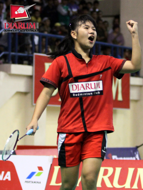 Ekspresi kemenangan Febby Angguni (PB Djarum) usai berhasil menaklukkan pemain Pertamina Indonesia, Ganis Nur Rahmadani