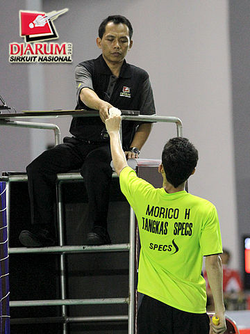 Morico Harda (Tangkas Specs) memberikan shuttlecock kepada wasit untuk diperiksa