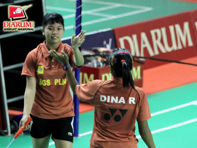 Pasangan Dina Rahayu/ Warih (SGS PLN) melakukan selebrasi.
