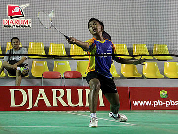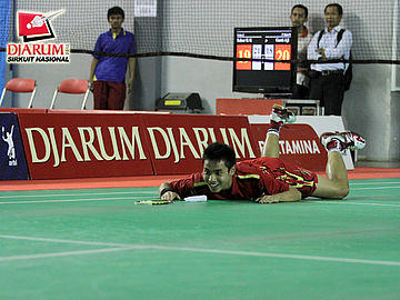 Kho Henrikho (PB Djarum Kudus) harus jatuh bangun saat meladeni Alamsyah Yunus (Pertamina Indonesia).