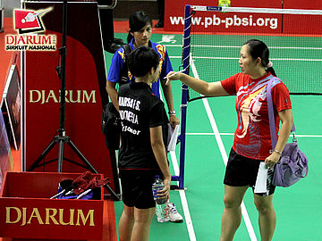 Dian (Jaya Raya) berhasil mengembalikan drop shoot yang dilepaskan Jesica (Ananda).
