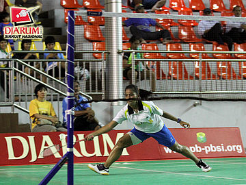 Dina Rahayu (SGS PLN) berupaya menggapai shuttlecock.