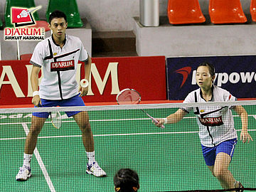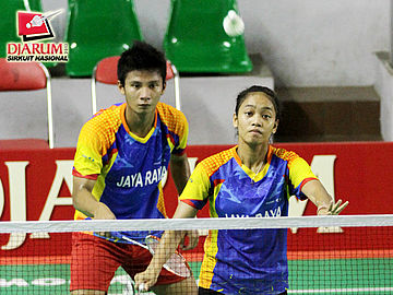 Sangaji (kiri) dan Clara asal PB Jaya Raya saat melepaskan serve.