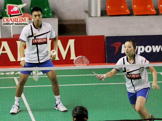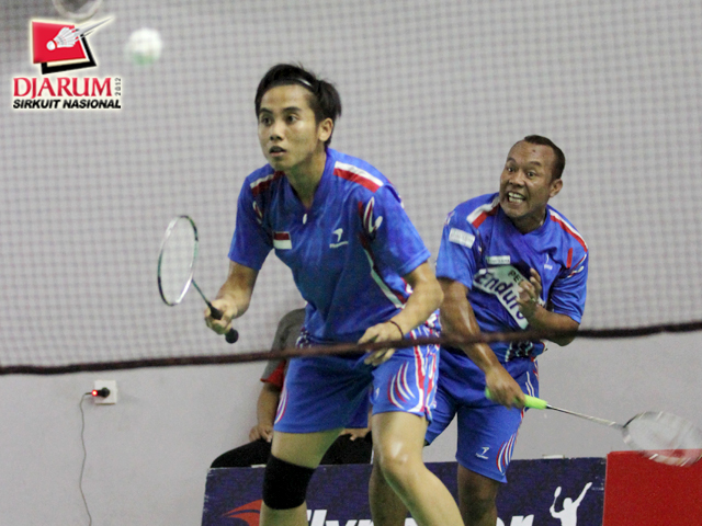 Della (kanan) dan pasangannya, Tedi asal PB Djarum Kudus menyambut serve dari Sangaji/Clara (Jaya Raya).