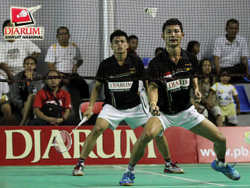 Pasangan ganda putra Pelatnas, Ronald/Selfanus gagal mengembalikan bola ke arah Kenas Adi/Sigid Sudrajat (PB Djarum Kudus).