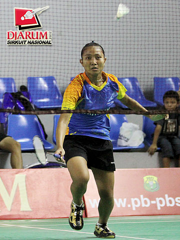Rusydina Antardayu (Tangkas Specs) berusaha keras untuk bisa mengembalikan shuttlecock ke arah lawannya.