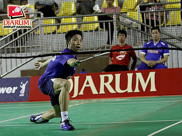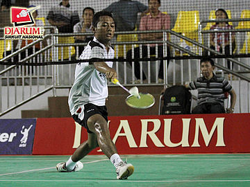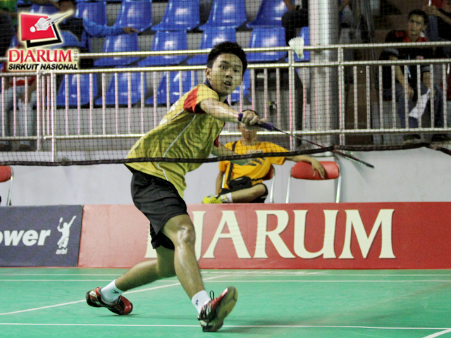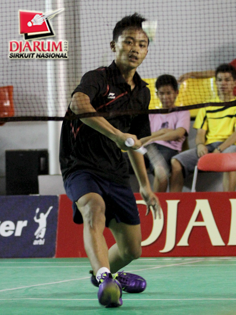 Bayu Pangisthu (PB Djarum Kudus) berusaha mengembalikan bola kepada Setyaldi Putra (Guna Dharma).