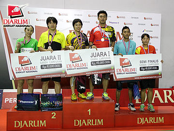 Para juara ganda campuran dewasa berpose bersama usai pembagian hadiah.