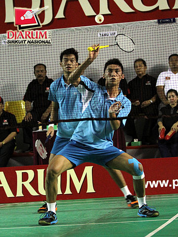 Ronald (depan) dan pasangannya dari Pelatnas, Selfanus Geh bersiap menyambut bola.