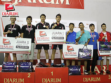 Para juara ganda putra dewasa berpose bersama usai pembagian hadiah.